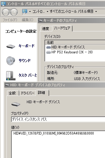 コントロールパネル → キーボード → 【タブ】ハードウェア → 対象のキーボードを選択 → プロパティ → 【タブ】詳細 → デバイスインスタンスパス