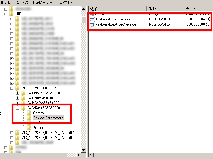 レジストリエディタで【 HKEY_LOCALMACHINE\SYSTEM\CurrentControlSet\Enum\HID 】へ。さっき調べた【デバイスインスタンス】の場所を探す。【Device Parameters】に英語キーボードなので下記の値を入力