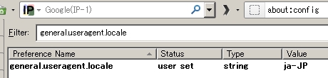 1.アドレスバーに about:config と入力2.フィルタに general.useragent.locale と入力